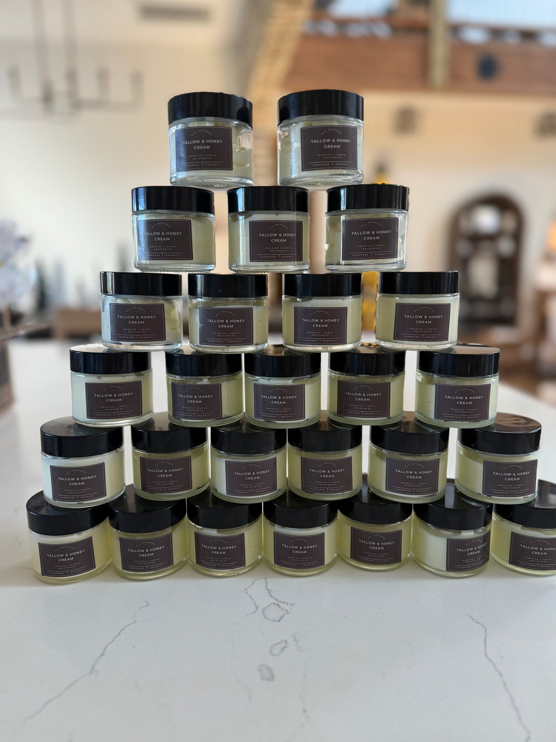 Our luxurious beef tallow is made with tallow from a local rancher who raises his cows organically. It is mixed with organic beeswax, high quality extra virgin olive oil, organic jojoba oil, organic rosehip oil, organic vit e oil, arrowroot powder, frankincense, vanilla, and sweet orange essential oils. 3 oz.